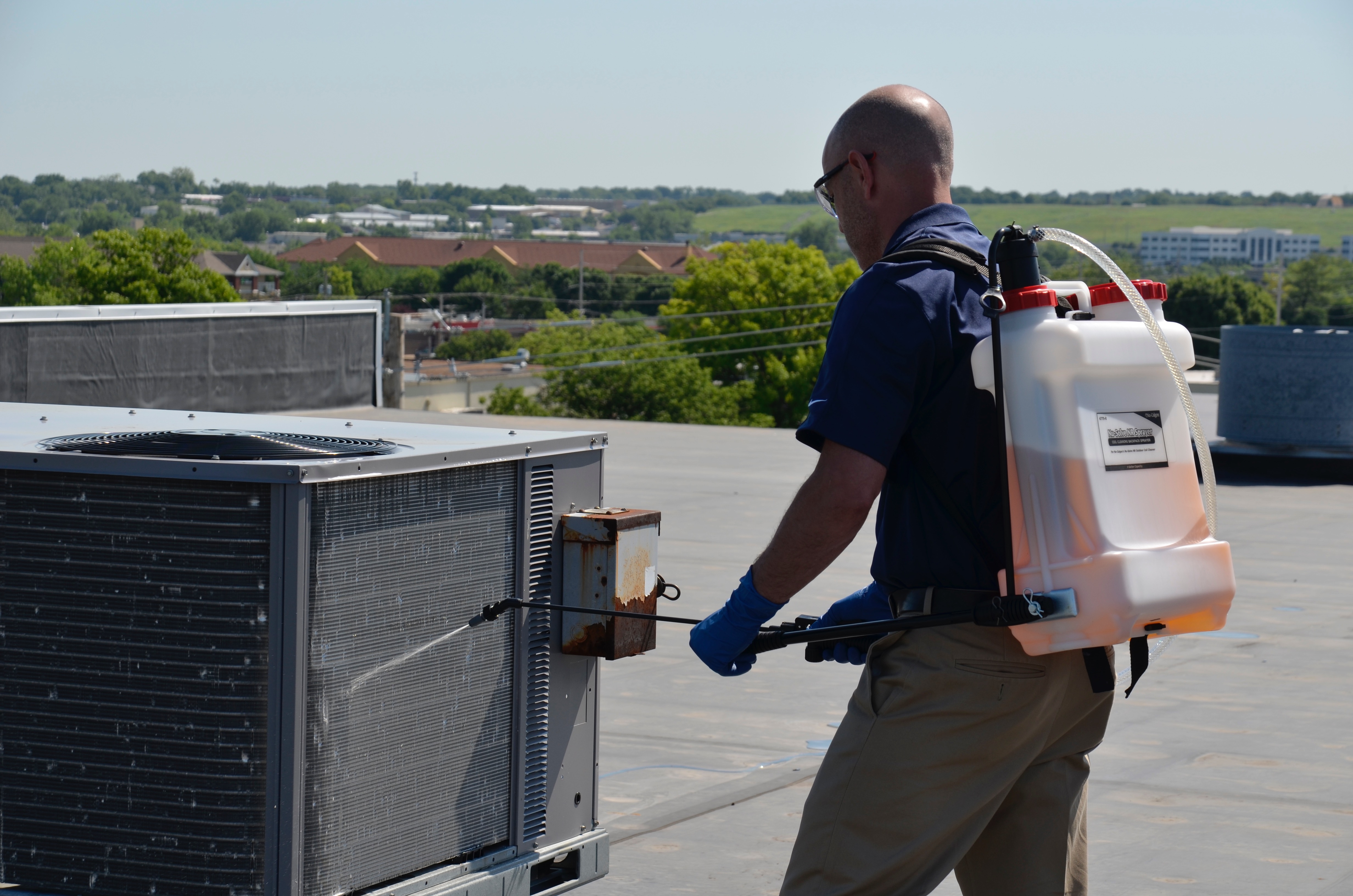 The cleaner is specially formulated for applications where water availability for rinsing the coil is problematic. Nu-Solve NR should be used when solvent based aerosol options are not economically practical, or where it is desirable to have less diluted coil cleaner on the roof when cleaning a line-up of dusty rooftop coils. Nu-Solve NR is an engineered, ready-to-use alternative than to merely spraying the coil with portable water since water alone does not address varying organic films that caused the soils to adhere to the coil in the first place. Nu-Solve NR emulsifies grime off the outdoor coil; simply spray the coil and go! For severely contaminated coils or embedded material (i.e., cottonwood), a more aggressive Nu-Calgon outdoor coil cleaner is required.